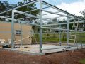 With our skillion sheds, we use heavy duty knee connection plates supplied in thick galvanised steel which bolt together with a minimum of 8 M12 bolts per plate. No light weight thin tek screwed main frame connection brackets from us!